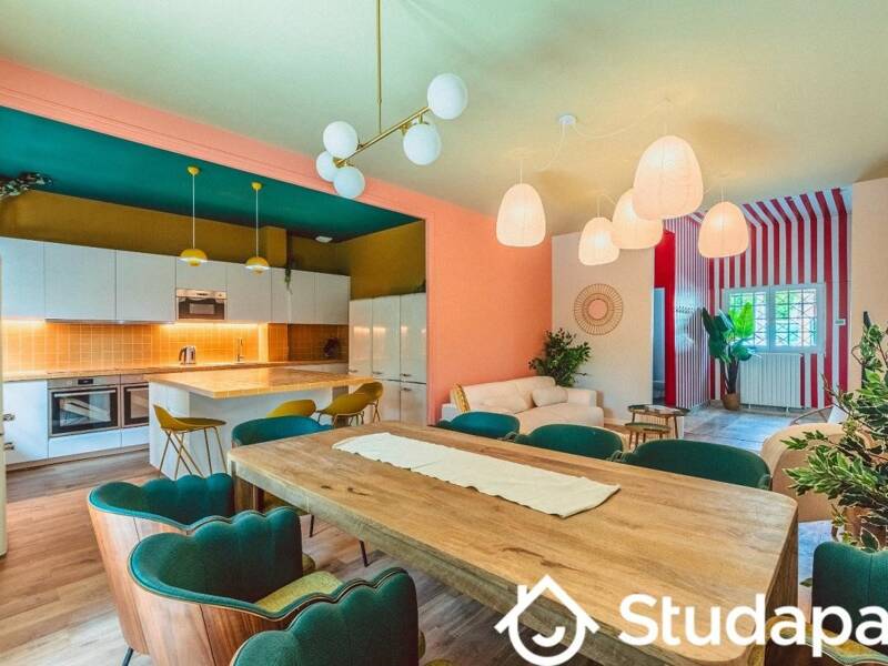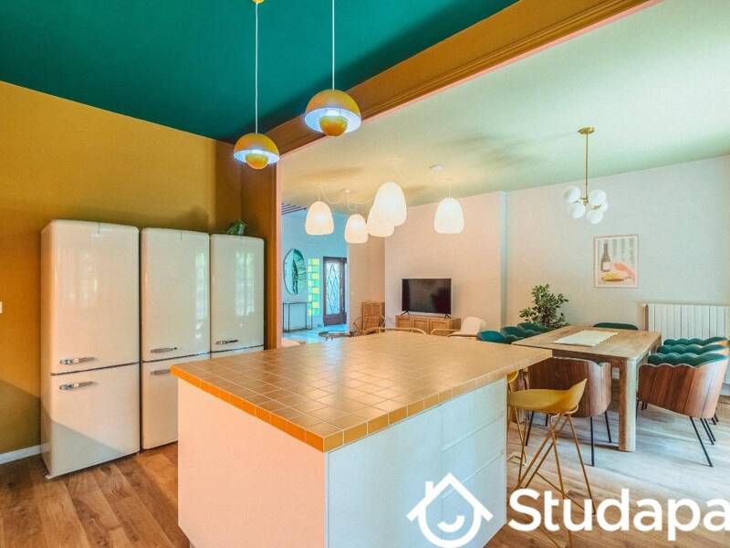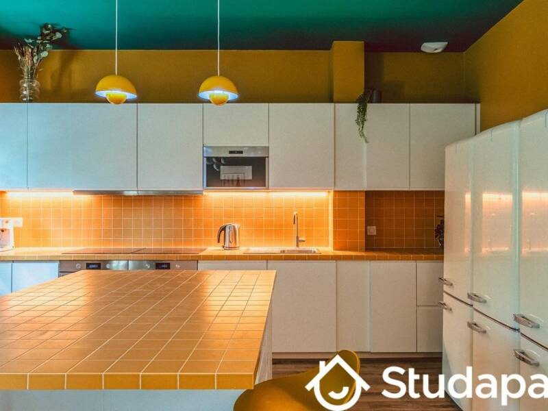 عند عبور الباب، تبرز المطبخ المعاصر الذي يجذب انتباهك. إنه مجهز بشكل جيد، ويشجع الجزيرة المركزية على النقاش بقدر ما تشجع على تحضير طبق لذيذ. تخيل عشاءً مفاجئًا مع زملائك في السكن أو مجرد فنجان قهوة مشترك في الصباح، لتجديد العالم.