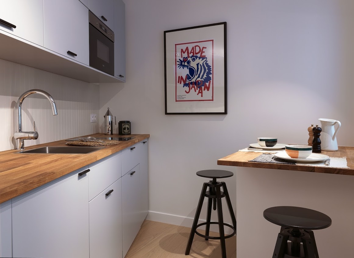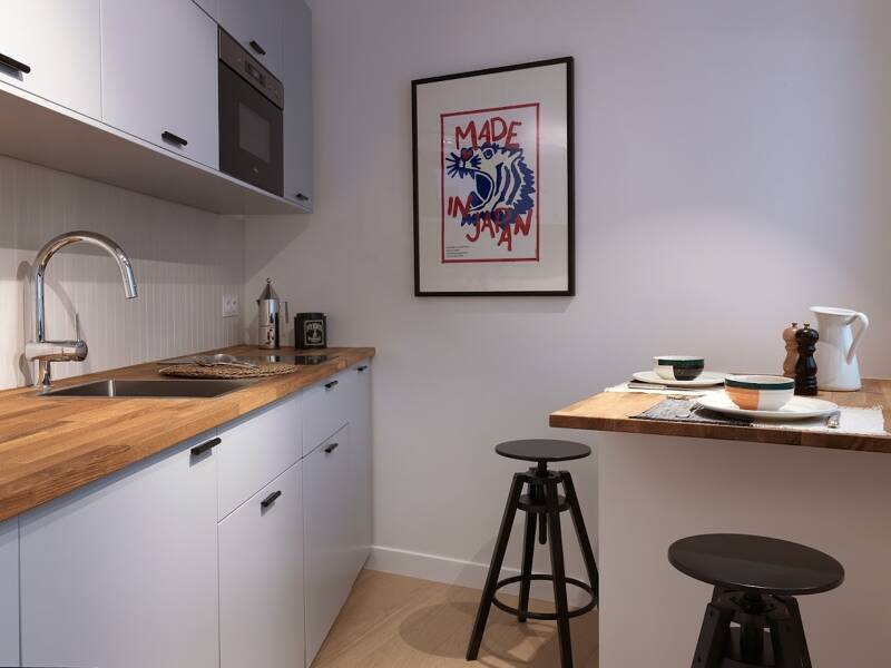 منذ دخوله، تعلن الغرفة الرئيسية عن نفسها: أناقة وفعالية. يسهّل التخطيط الحياة اليومية. المطبخ، المجهز بكل الضروريات، يمد لك ذراعيه. حضّر وجباتك كما تشاء أو ارتجل عشاءً مع الأصدقاء. الحمام، البسيط والعصري، يضيف لمسة من الحداثة. هنا، كل شيء له مكانه. في باريس، هذه ليست مسألة بسيطة. التركيبة تؤكد على سهولة الحياة الحقيقية، مما يجعل من قيود المساحة ميزة.