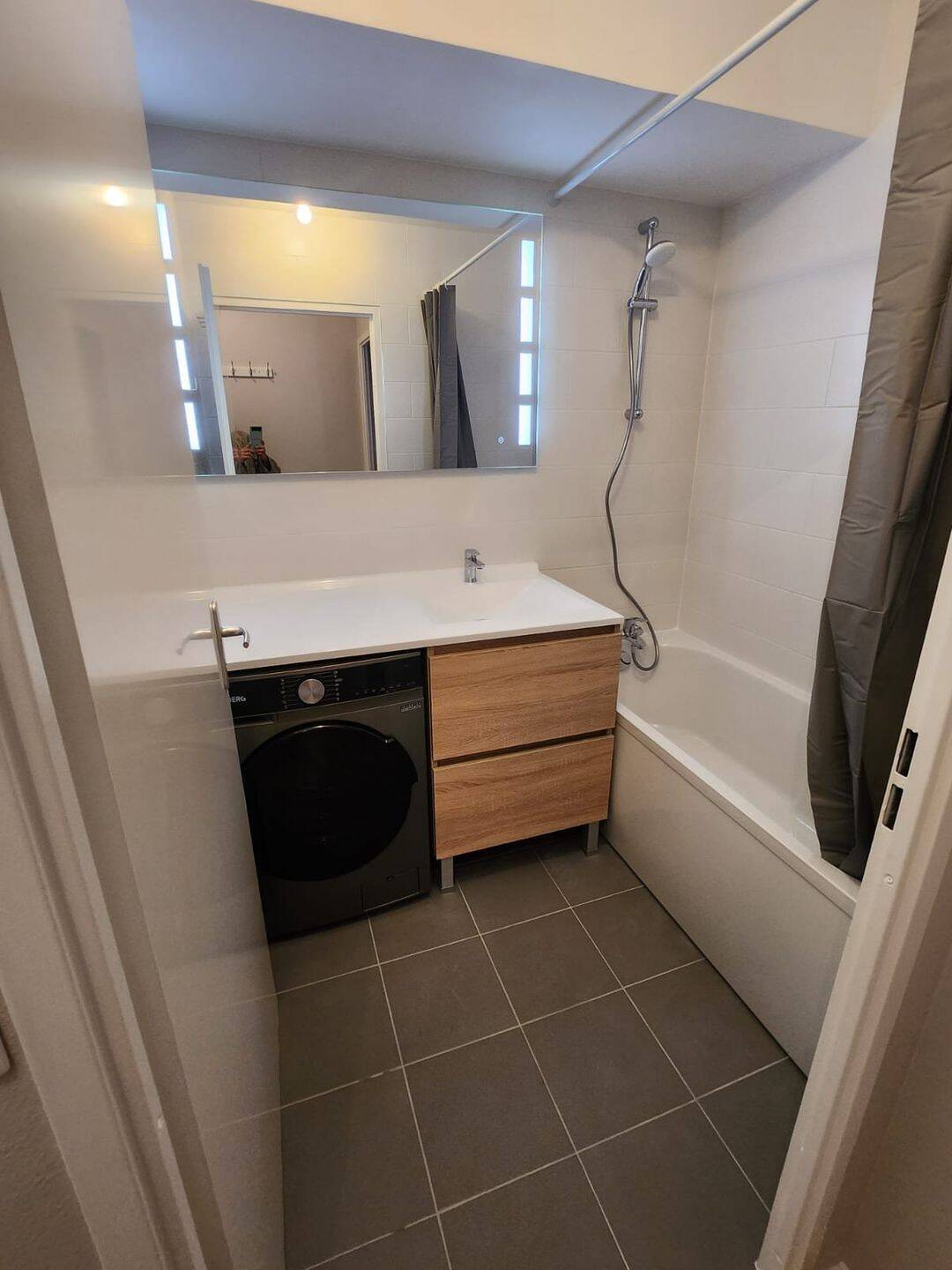 La salle de bain poursuit dans la même veine : véritable espace de confort, avec une baignoire spacieuse, un miroir à éclairage doux et une machine à laver 7 kg toute récente. Un exemple ? Vous rentrez d’une journée intense, tout ce qu’il faut pour souffler vous attend, accessible et efficace.