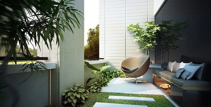 - Un balcon actuel, baigné de lumière, prolonge la maison vers l’extérieur.
