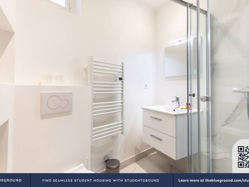 La salle d’eau, contemporaine, combine douche spacieuse et toilettes. Rien de plus confortable après une longue journée en ville. La présence d’un lave-linge séchant fait toute la différence, surtout pour les séjours prolongés. Un coin bureau complète le tableau, pour travailler ou gérer ses affaires au calme, sans compromis.