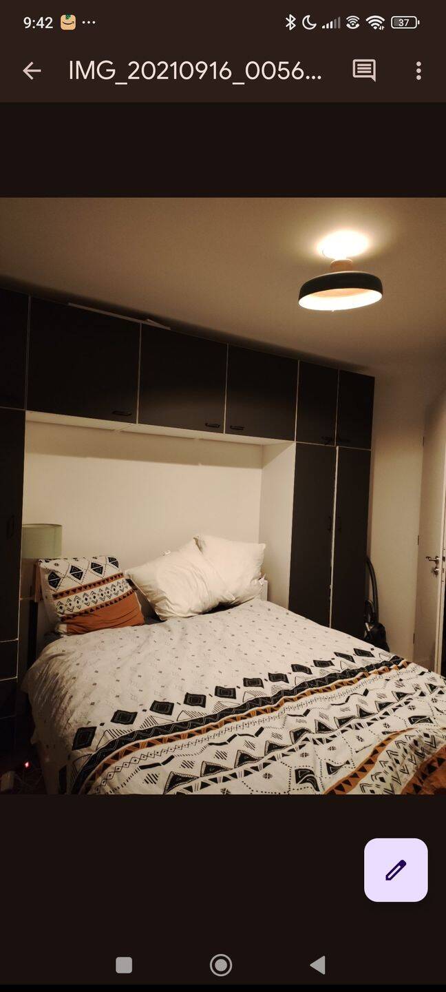 L’appartement se prolonge avec une chambre indépendante équipée de placards intégrés. Aucun compromis sur la tranquillité nocturne – vous dormez loin de l’agitation. La salle de bain vous attend pour vos rituels de fin de journée, avec une baignoire invitant à la pause, ambiance spa privé garantie.