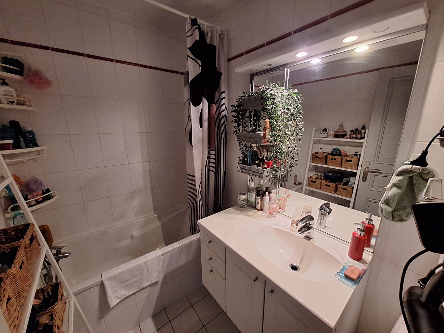 Une salle de bains, aménagée avec soin, invite au relâchement. À côté, un dressing pensée pour faciliter l’organisation, abritant vestes et effets personnels à l’écart du regard. L’appartement prend ses quartiers au deuxième étage, dans une copropriété de six niveaux. L’équilibre parfait entre discrétion et accessibilité.