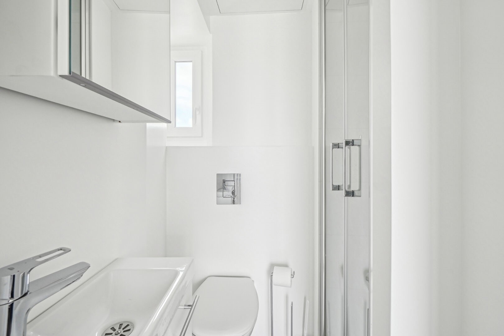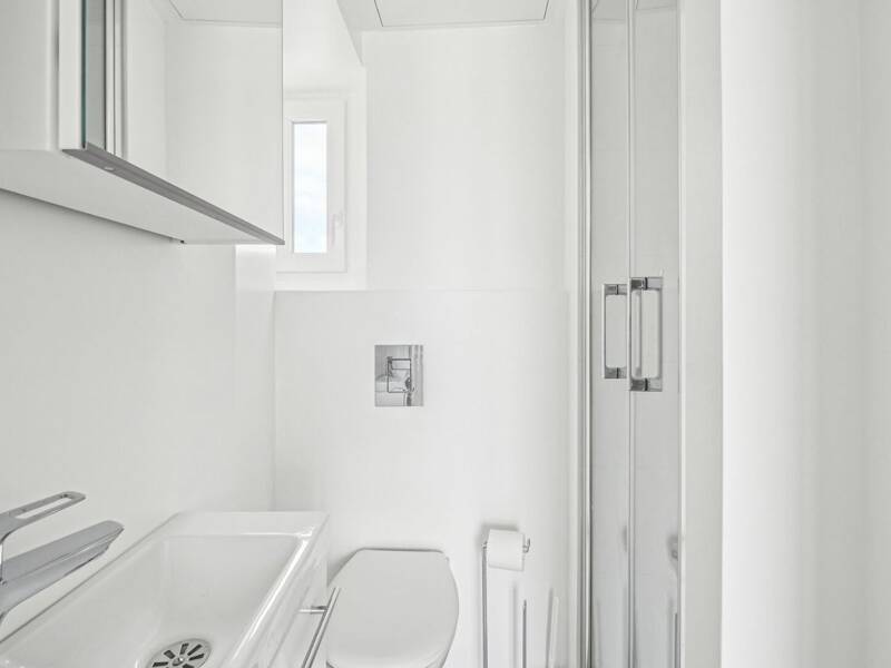 Côté salle d’eau, le parti-pris de la fonctionnalité : douche contemporaine, toilettes intégrées, rien ne manque à l’appel. Perché au 4e étage d’un immeuble soigné, le souffle de la ville monte vers vous, sans jamais altérer la tranquillité recherchée.