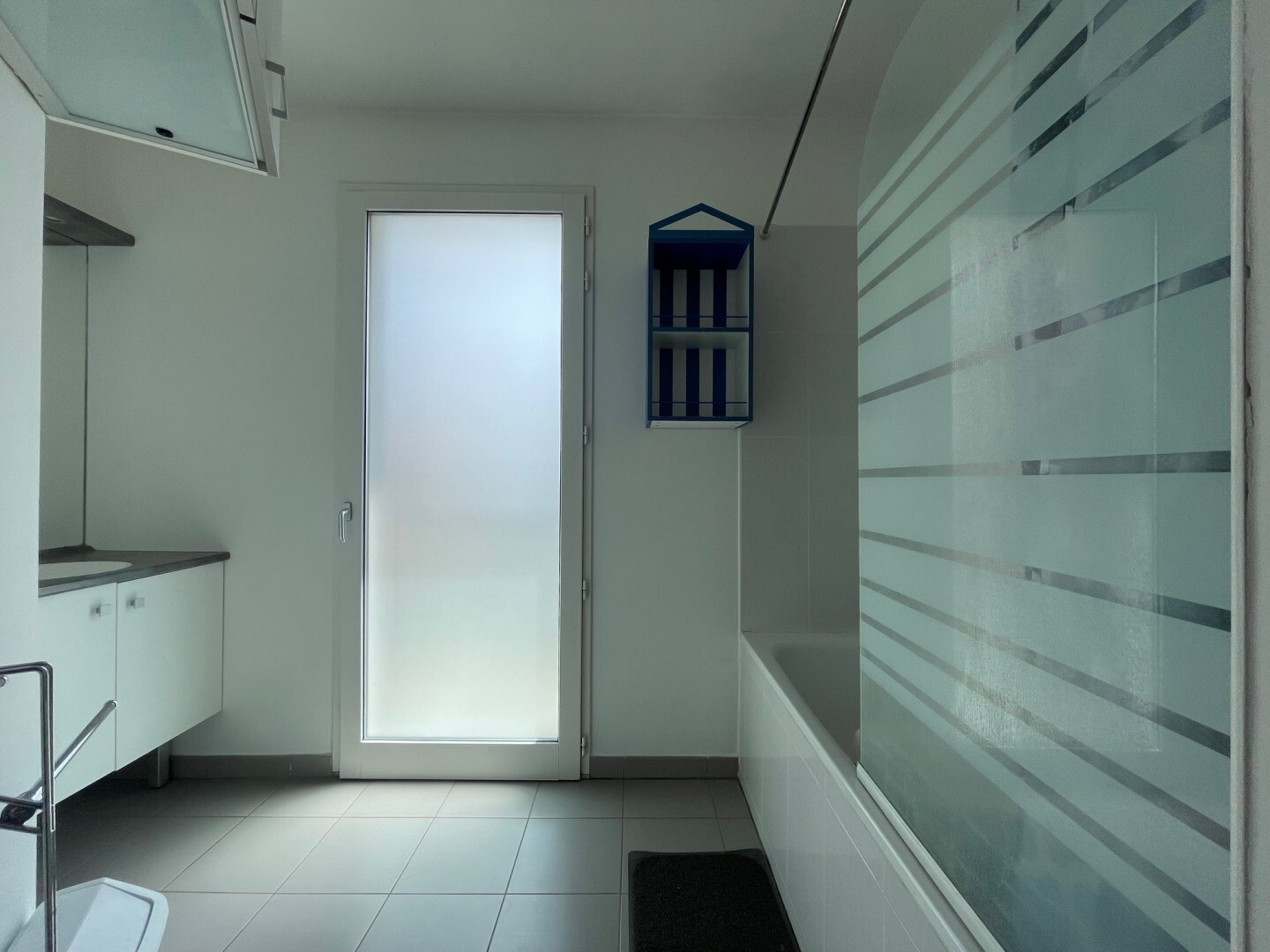 L’appartement propose aussi une salle de bains actuelle qui s’ouvre largement sur l’extérieur. Un bain de lumière accompagne chaque instant de détente. On y trouve aussi un toilette séparé et un vestiaire malin pour organiser sans effort le quotidien.