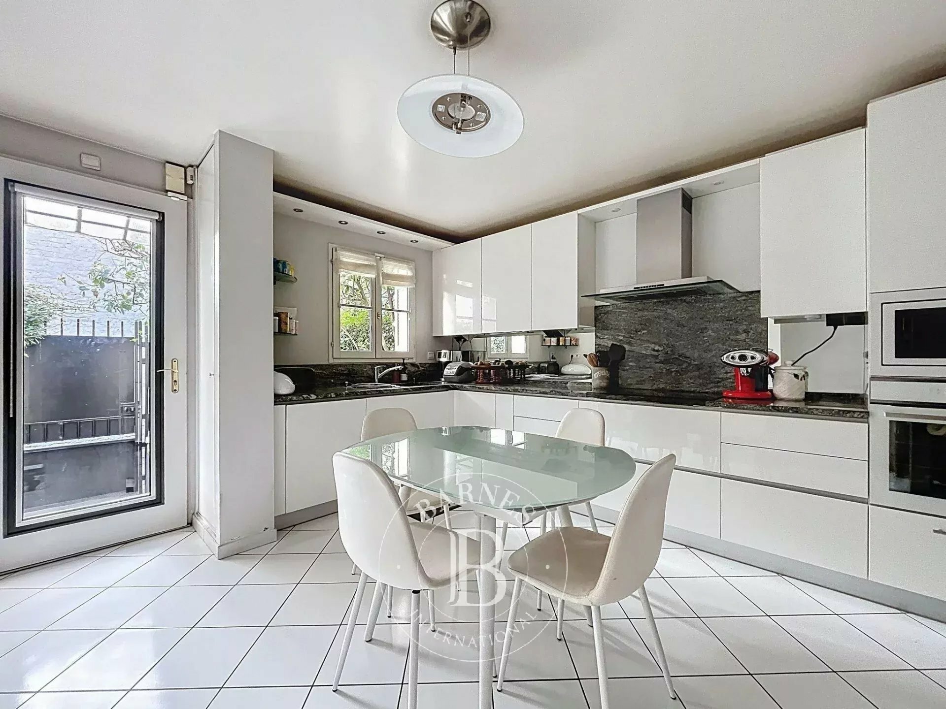 On the garden level, the living room opens directly onto a 32.87 sqm terrace — a rare asset in the heart of Paris. Imagine during the summer, having lunch outdoors, or in the autumn, enjoying a coffee away from prying eyes. The adjoining dining room and the equipped kitchen invite you to enjoy stress-free dinners, whether welcoming family or business associates.