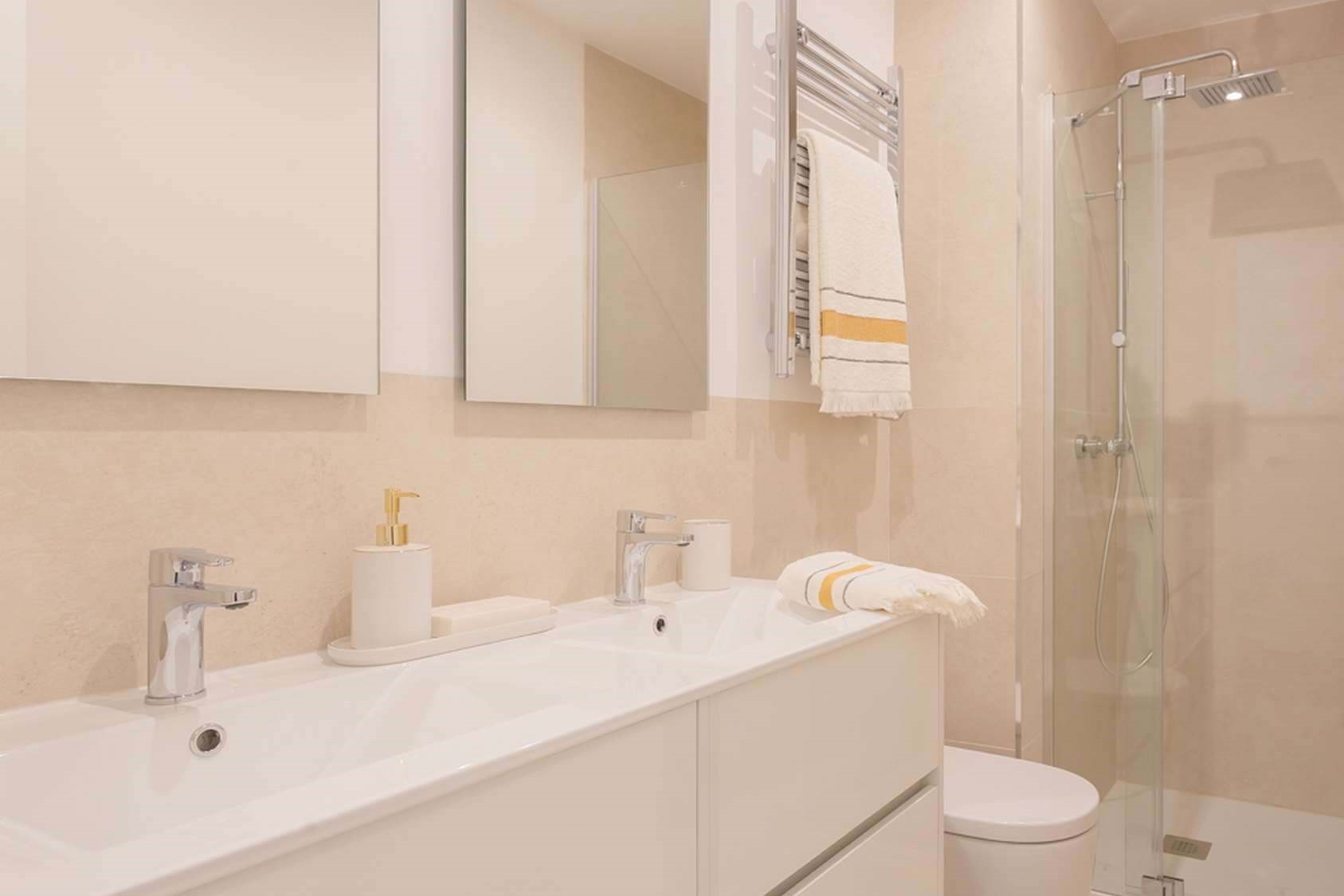 For the sleeping area, you have two distinct bedrooms. Each one is designed to maximize tranquility – it is impossible to be disturbed by noise in the early morning here. The two bathrooms facilitate daily organization, especially during peak hours, and their design combines simplicity and efficiency.