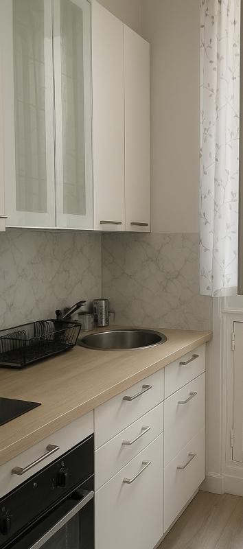 The entrance immediately sets the tone: a spacious living area, beautiful cross-light, sleek and functional furniture. A soft sofa for reading or Netflix evenings, a proper double bed for uncompromising rest, and a large mirror wardrobe that visually doubles the space. Double-glazed windows filter out urban commotion, while the natural exposure diffuses a soothing brightness. It’s a cocoon, an invitation to relax, or to graciously host a few friends over a drink.