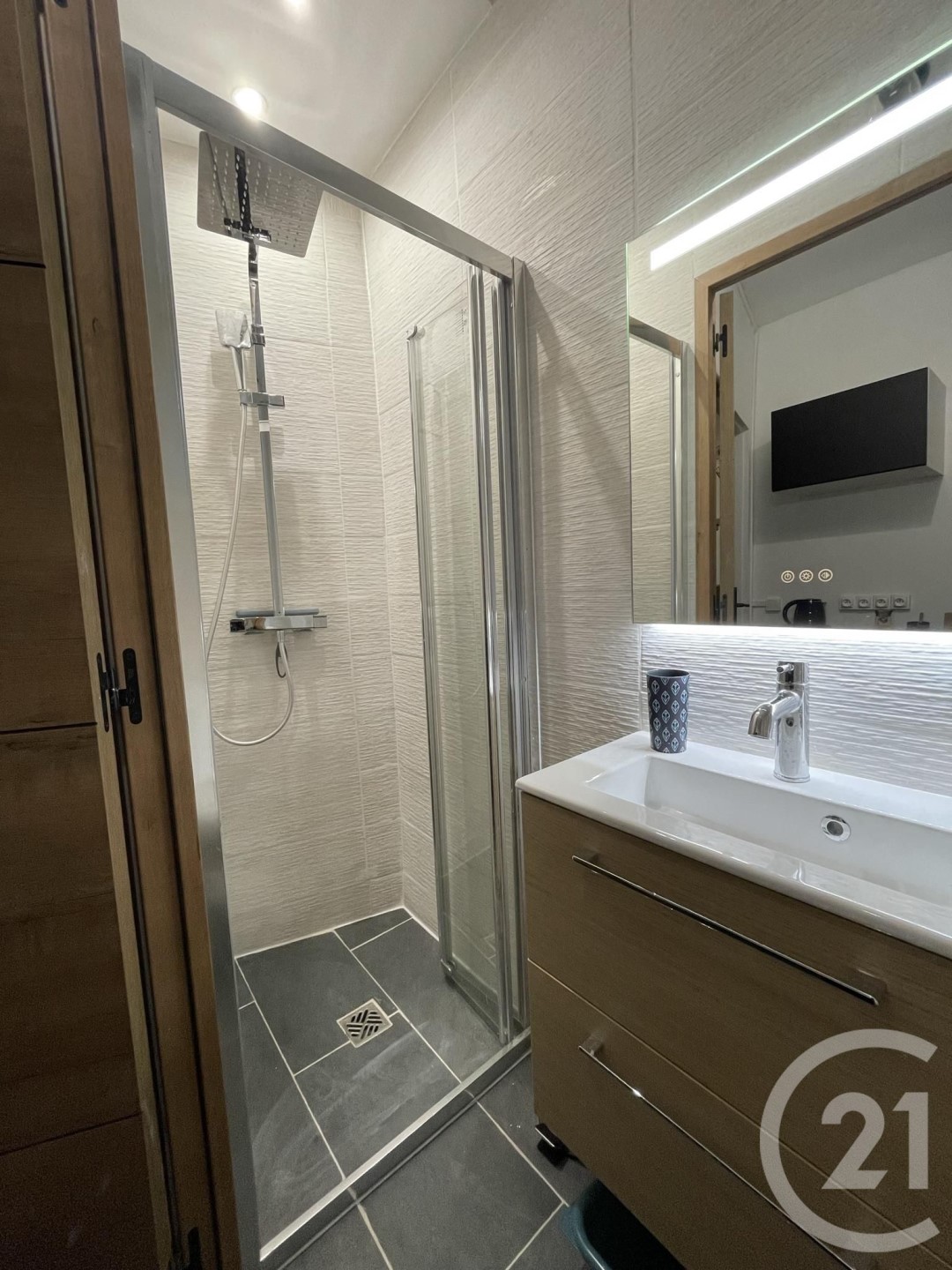 - A concise bathroom, integrating a toilet and shower, easy to maintain, and undeniably contemporary