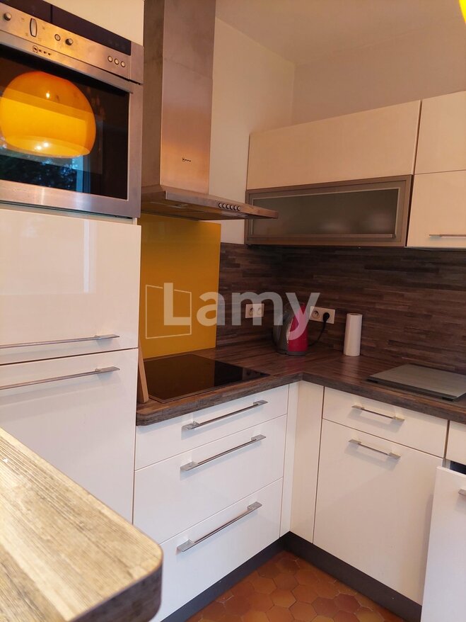 At the center of the home, the living room makes a statement. Here, the open kitchen invites seamlessly. Modern and fully equipped, it never compromises on utility for pleasure. This choice of configuration encourages social interactions and simple joys—hosting friends over drinks, improvising a weekend brunch… Upon entry, numerous storage options, always practical, signal the attention given to every detail, even the most discreet. A few steps away, the dining area takes over, bathed in a calming atmosphere.