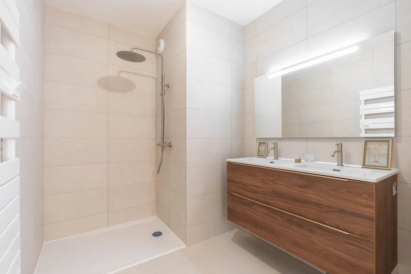 The living space naturally revolves around an open contemporary kitchen. This ensemble exudes warmth and friendliness. Do you love to entertain? Two terraces of 10 sqm each extend the living areas, perfect for enjoying a sunrise with a coffee in hand, or extending conversations until dusk. Every nook has been designed to prioritize fluidity and well-being in everyday life.