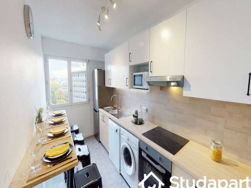Shared living reaches new heights, as we are talking about the twelfth floor, of course accessible by elevator. The panoramic view offers you a daily routine with Paris at your eyes — away from the hustle and bustle but never far from the essentials. On the practical side, the kitchen boasts a professional-grade setup: fridge, cabinets, utensils, washing machine… everything you need to whip up a meal or host an impromptu dinner.