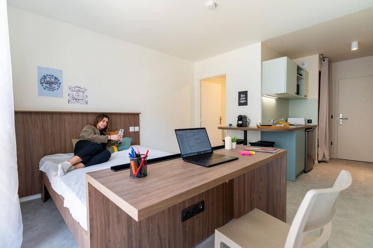 Here is a unique studio apartment of 45 sqm nestled within the Good Morning Cergy residence. Here, everything is designed to infuse energy and friendliness into student life. From the entrance, the contemporary atmosphere is striking. Spaces are intelligently distributed. Nothing has been left to chance to embrace a lifestyle balanced between work and shared pleasures.