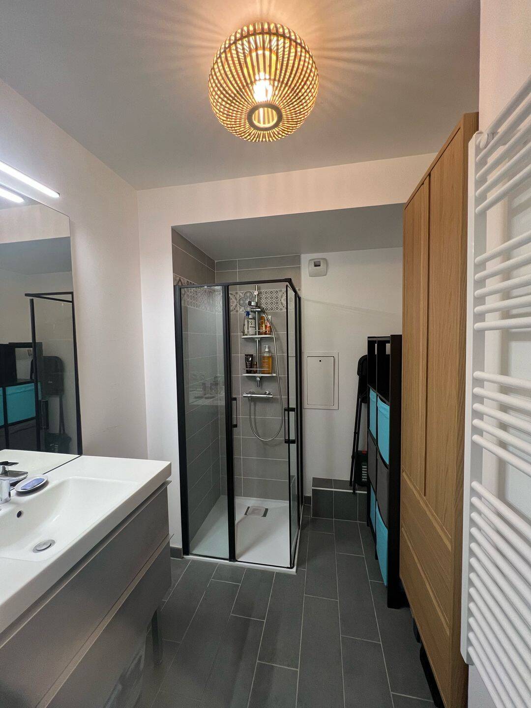 The bright, efficiently designed bedroom also features a small office area — ideal for remote work or just organizing your files. Every corner is maximized, with no wasted space. The contemporary bathroom completes the ensemble. The toilets are separate, a comfortable asset that you end up appreciating in everyday life.