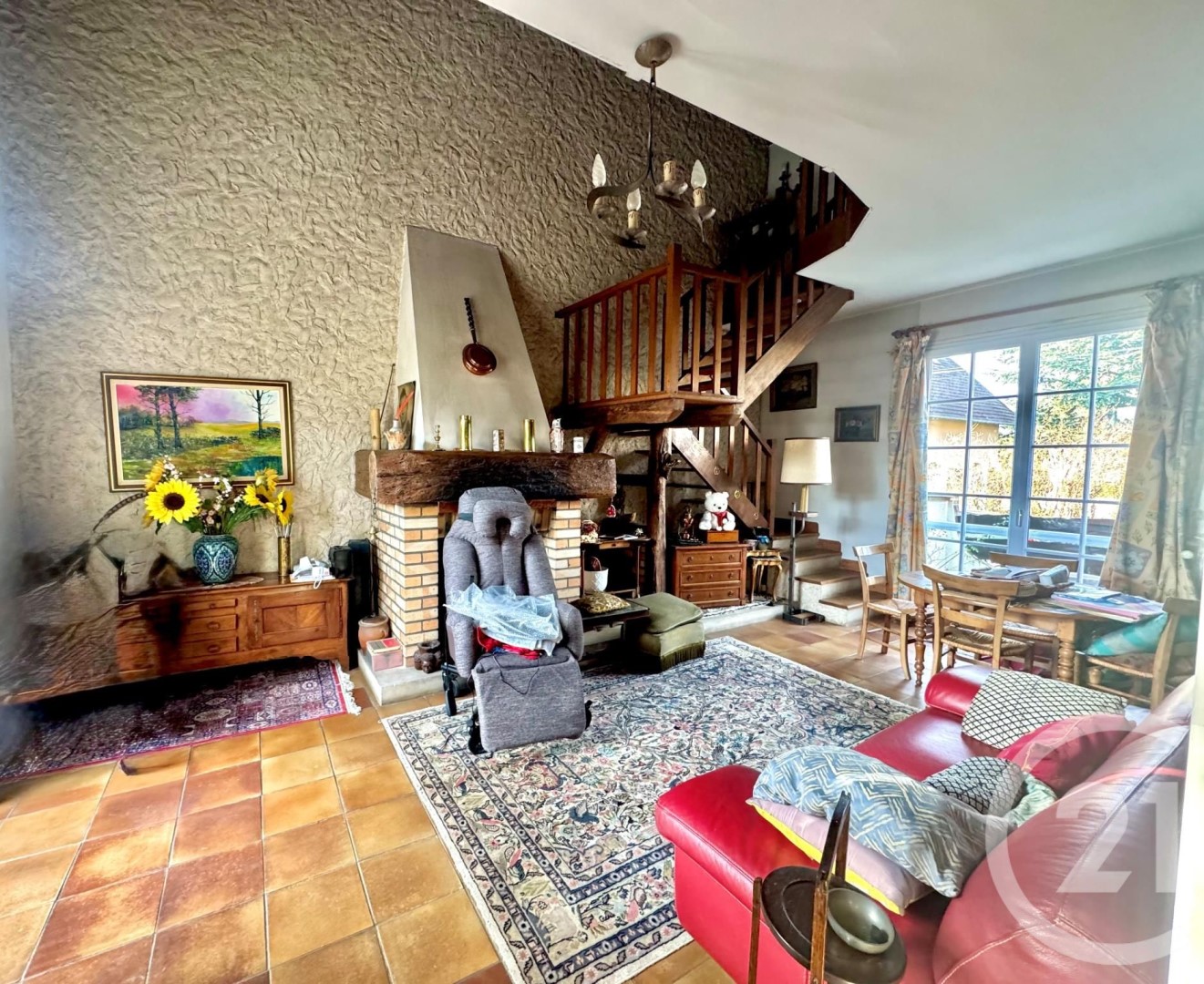 Il piano superiore è stato organizzato senza false note: due camere dall'atmosfera tranquilla, uno studio — ideale per lavorare da casa in piena concentrazione — e un bagno pensato per la vita moderna. Proseguite la visita e lasciatevi incantare da un soggiorno a navata alta dove il volume colpisce. Il camino invita al relax, inverno come estate. Una camera aggiuntiva al piano superiore offre sia il proprio bagno che la tranquillità ben meritata.