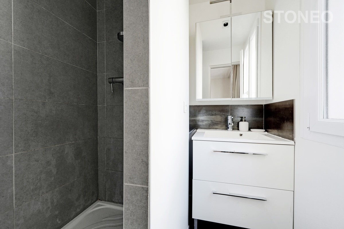 Superato il sog threshold, il piano intelligente rivela tutto il suo potenziale. Un corridoio disegna l'accesso a una lavanderia funzionale, a un bagno, quindi si apre su un soggiorno con ampie finestre attraversate, orientate a Est/Ovest. Risultato: ogni momento in questa stanza è immerso nella chiarezza, anche nei giorni grigi parigini.