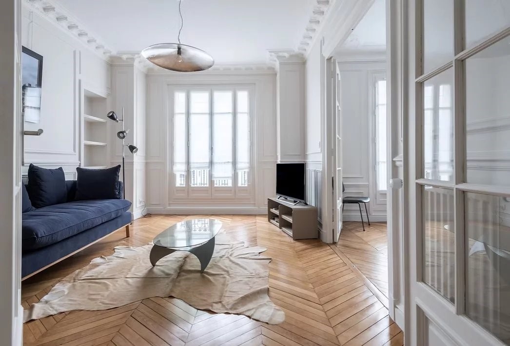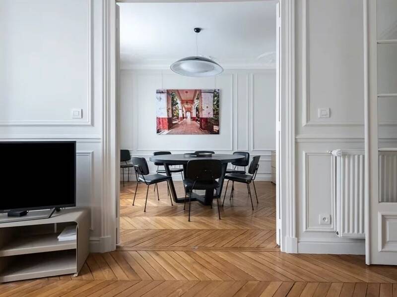 Il soggiorno lascia il segno fin dai primi passi. Il legno del parquet, posato con cura da un capo all'altro dello spazio, apporta un calore autentico, raro in questo settore. La luce entra generosamente attraverso ampie aperture con doppio vetro, creando al contempo calma e protezione dalle stagioni. Le cornici patinate, il camino d'epoca: questi tocchi antichi danno profondità all'insieme, come un elegante omaggio al passato parigino che sa dialogare con la modernità dei luoghi.