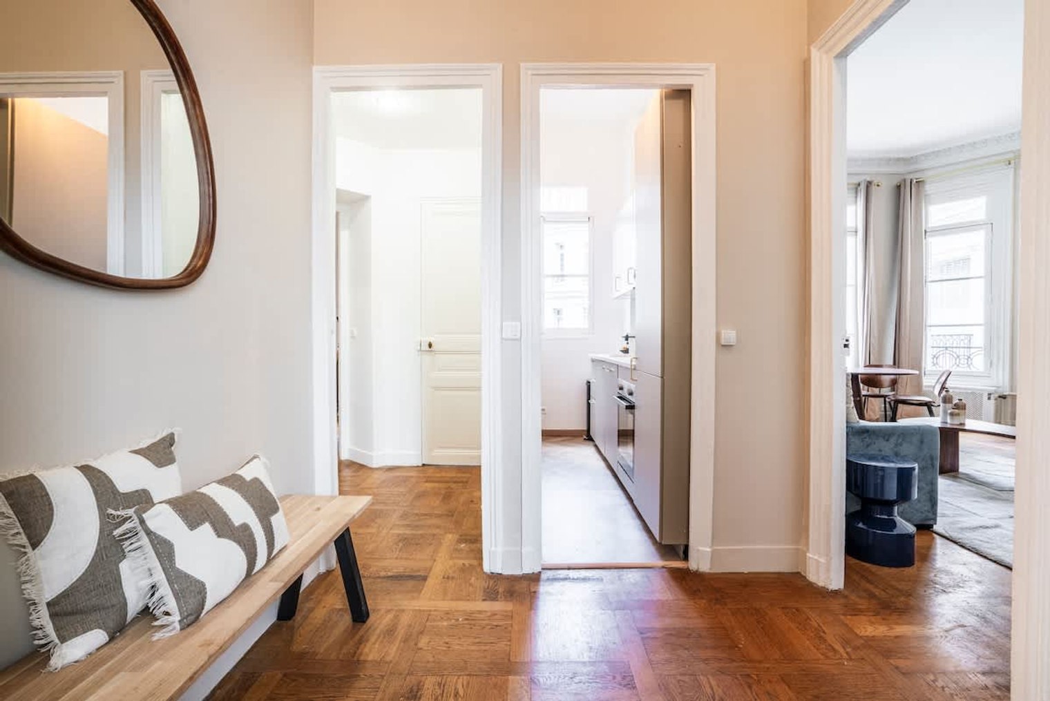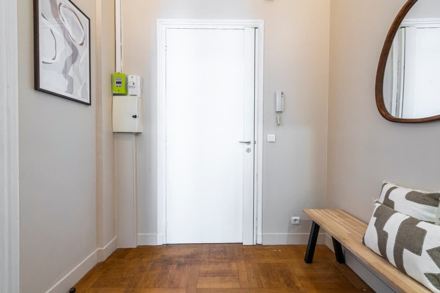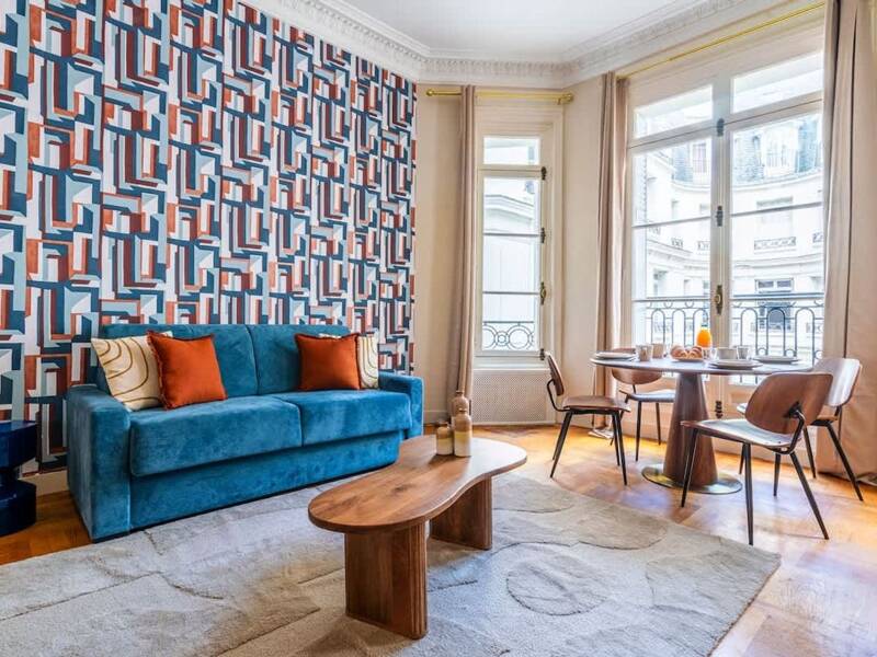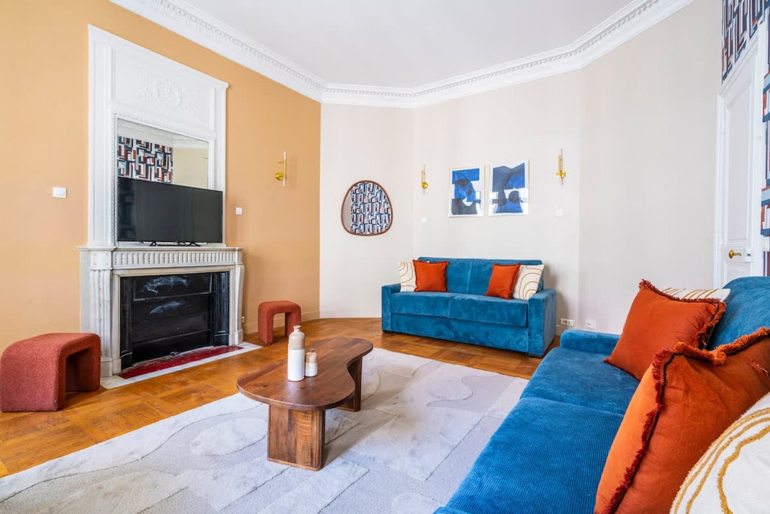 Appena entrati, il soggiorno vi invita a rilassarvi. Due ampi divani letto offrono tanto spazio per accogliere i vostri cari, lavorare o semplicemente riposare. I soffitti alti, le cornici e le ampie finestre ricordano ad ogni istante perché gli edifici haussmanniani rimangano un riferimento. Accanto, un tavolo da pranzo confortevole accoglie facilmente famiglia o amici per un pasto improvvisato o una cena curata.