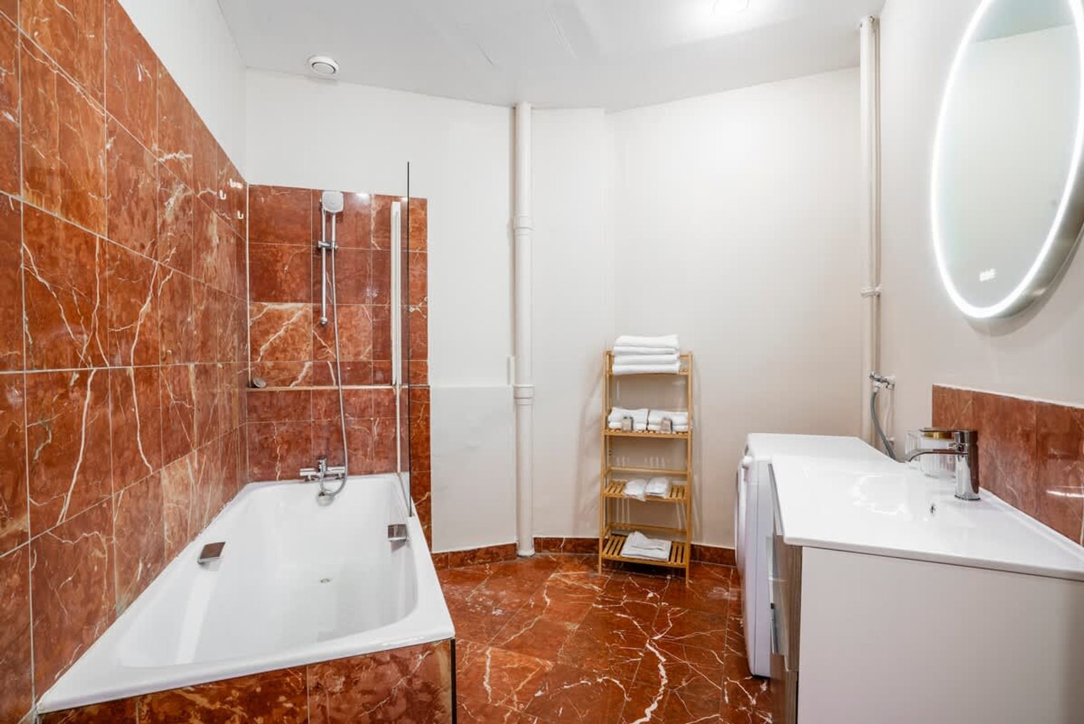 Nella camera da letto, troverete un letto queen-size: il giusto per ritrovare un sonno riposante, anche dopo una giornata intensa. Il bagno, dotato di vasca, invita al relax dopo un andare e venire al Trocadéro. La biancheria da letto, accuratamente selezionata, è a disposizione fin dal vostro arrivo. Posate le valigie, tutto è pronto.
